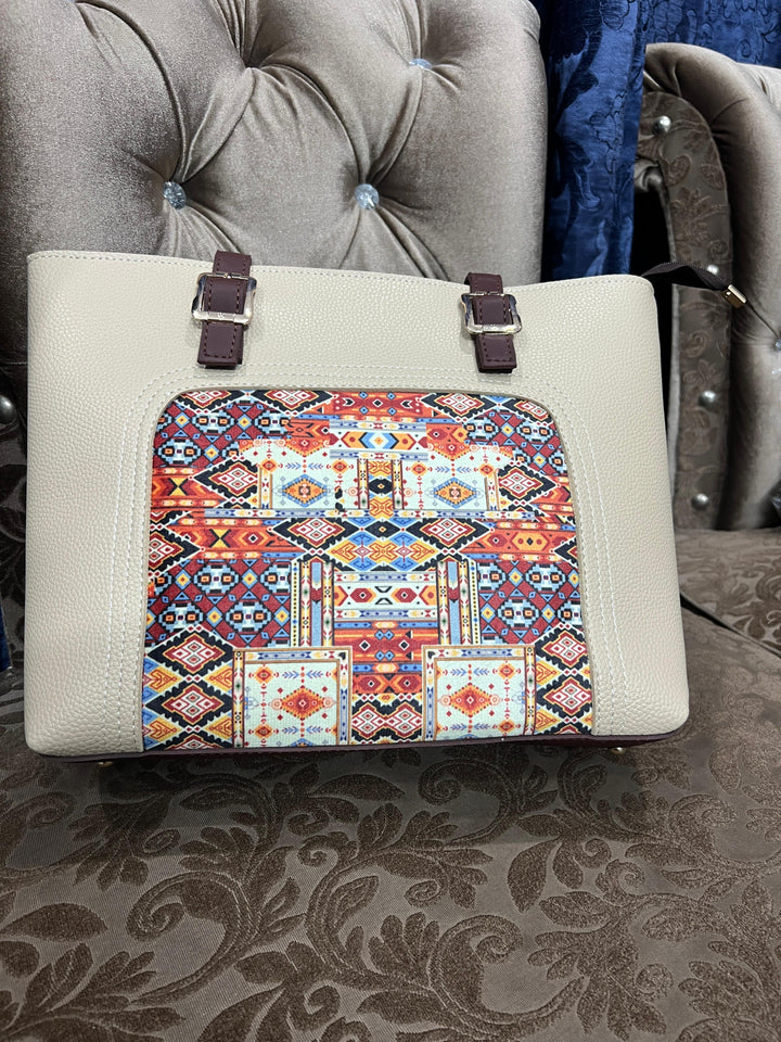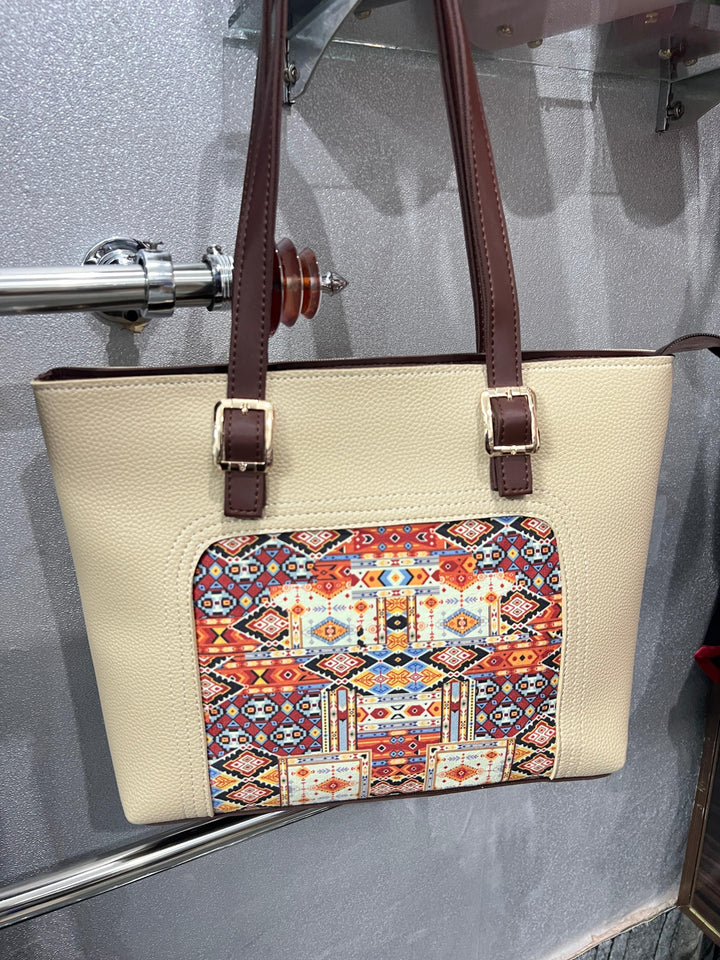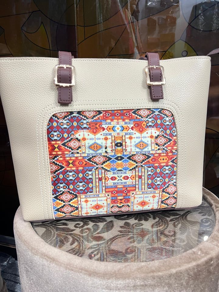 Cream Leather Bag with Colorful Patch