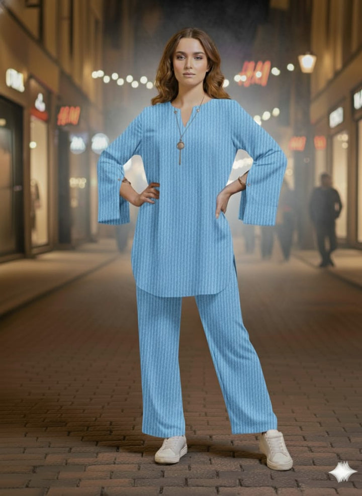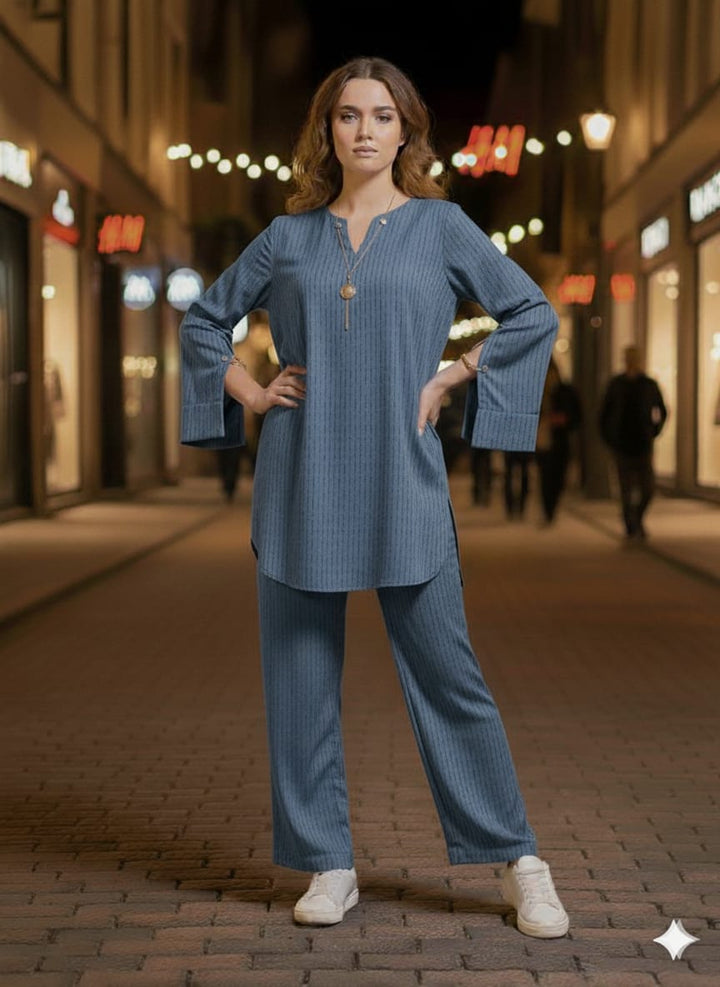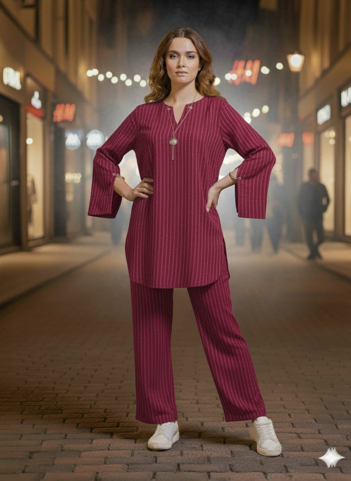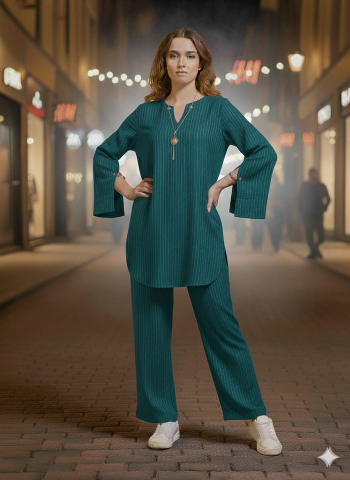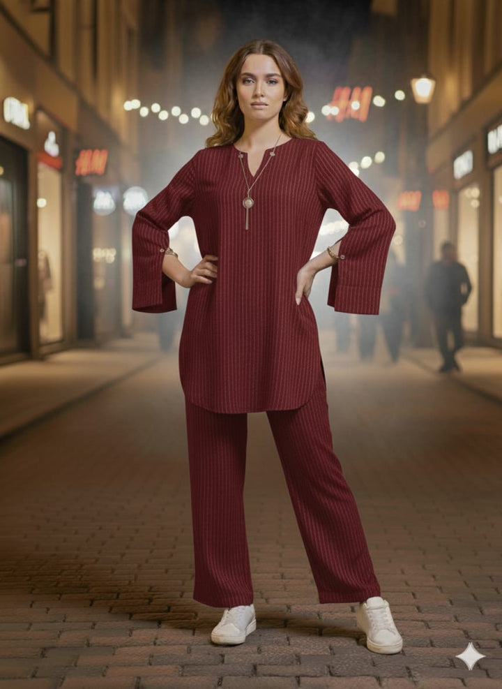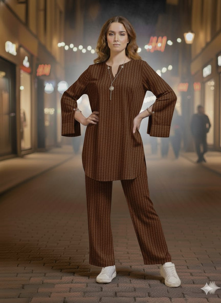 This winter co-ord set is stitched in jacquard fabric with a necklace-style neckline that adds a sharp, dressed-up touch. It comes in a standard size with a clean, structured look — easy to wear, warm, and perfect for everyday winter styling. A simple outfit upgrade without overthinking it.