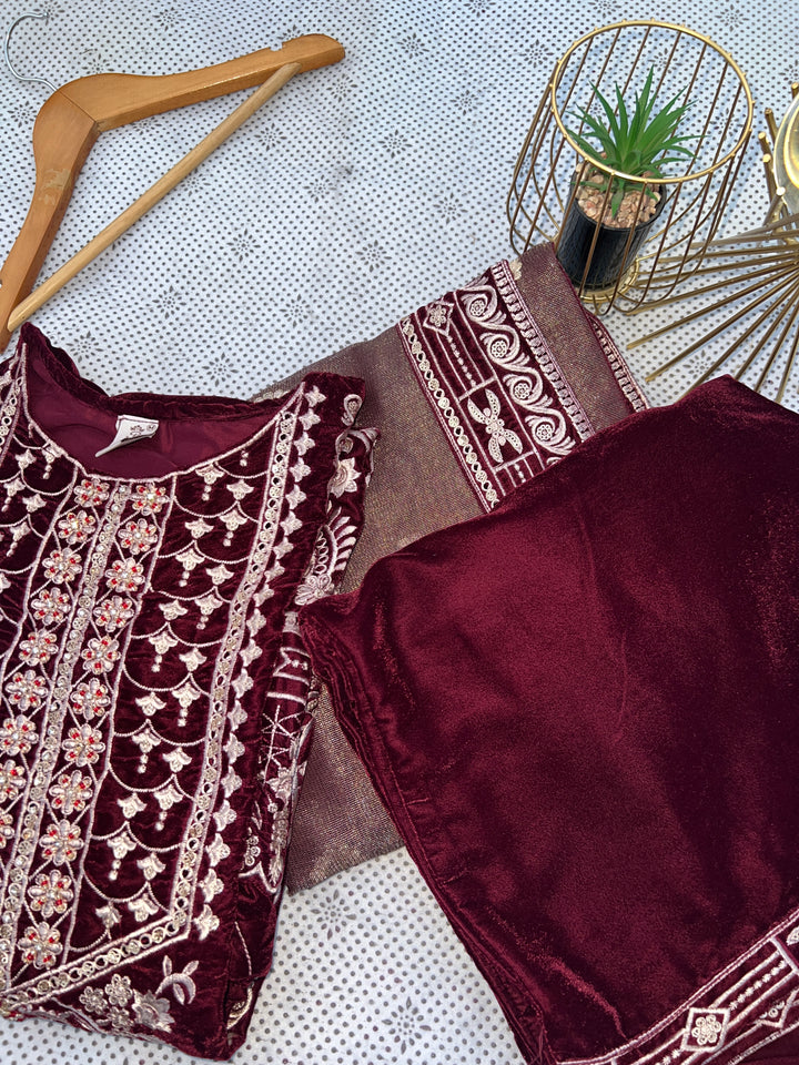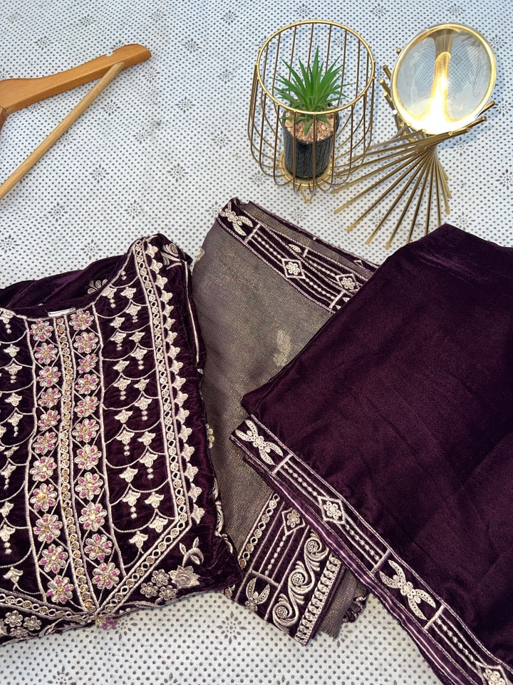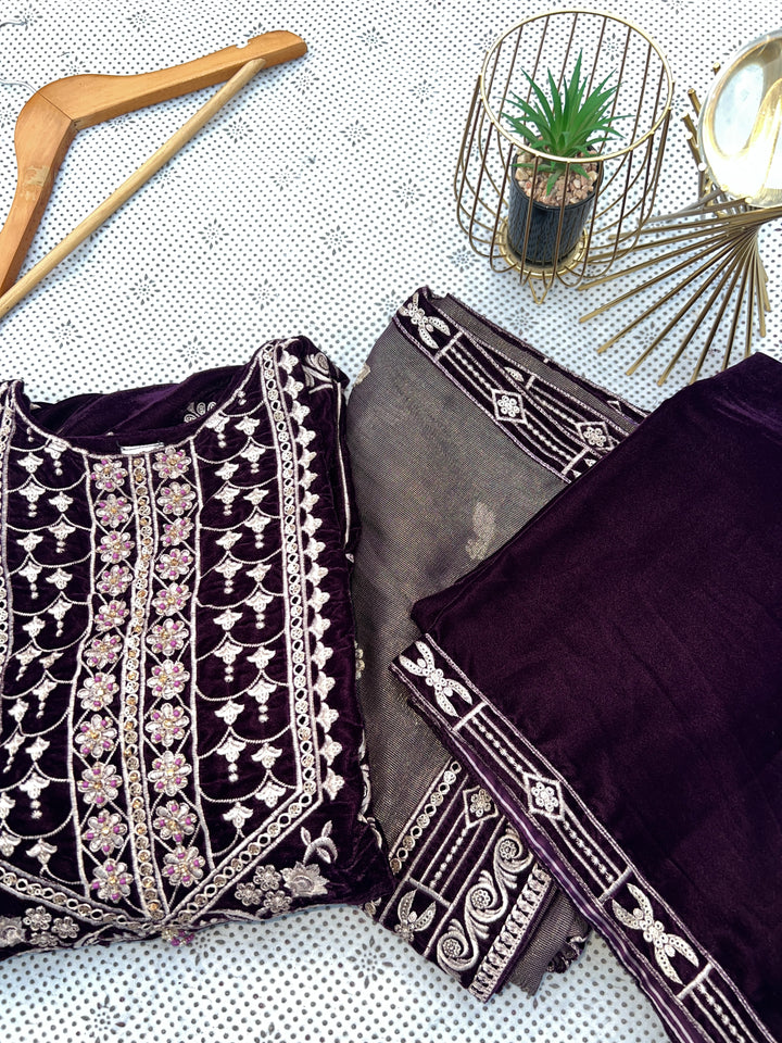 Plum Velvet 3-Piece Embroidered Suit with Masoori Dupatta