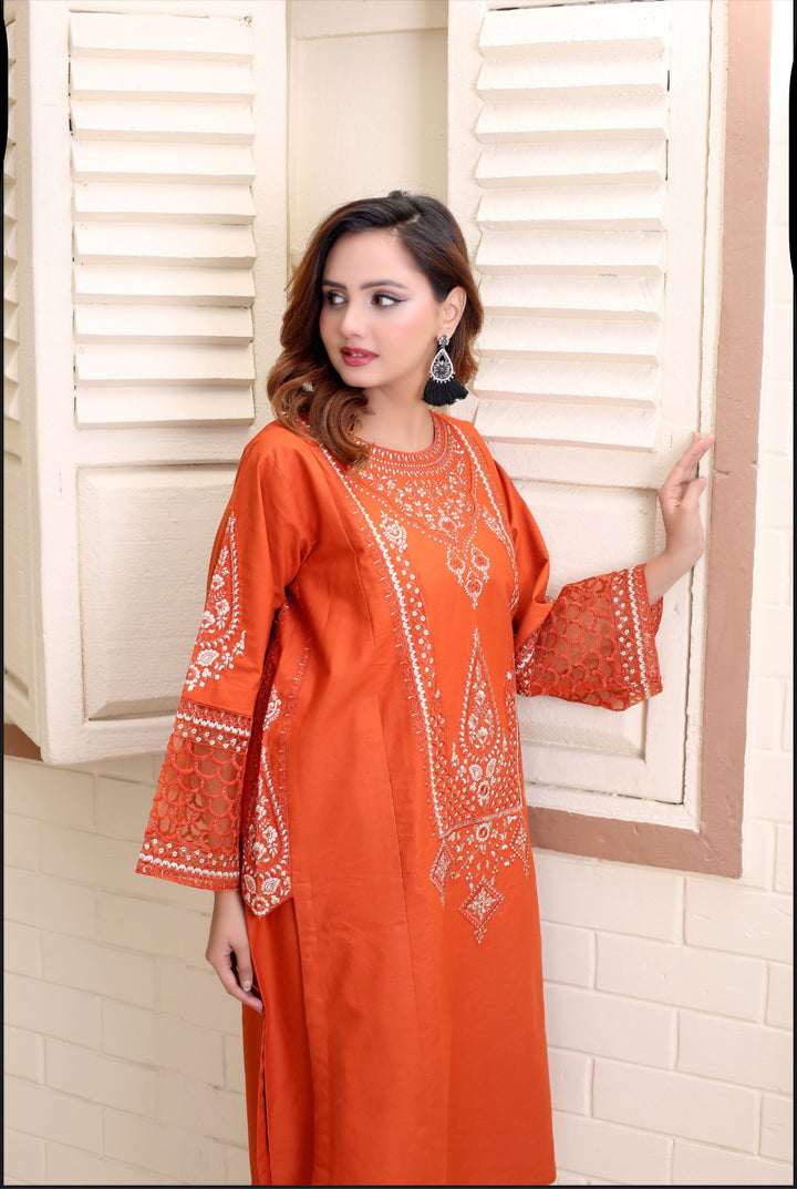 Rust Orange Embroidered Jeans Khaddar 3-Piece Suit
